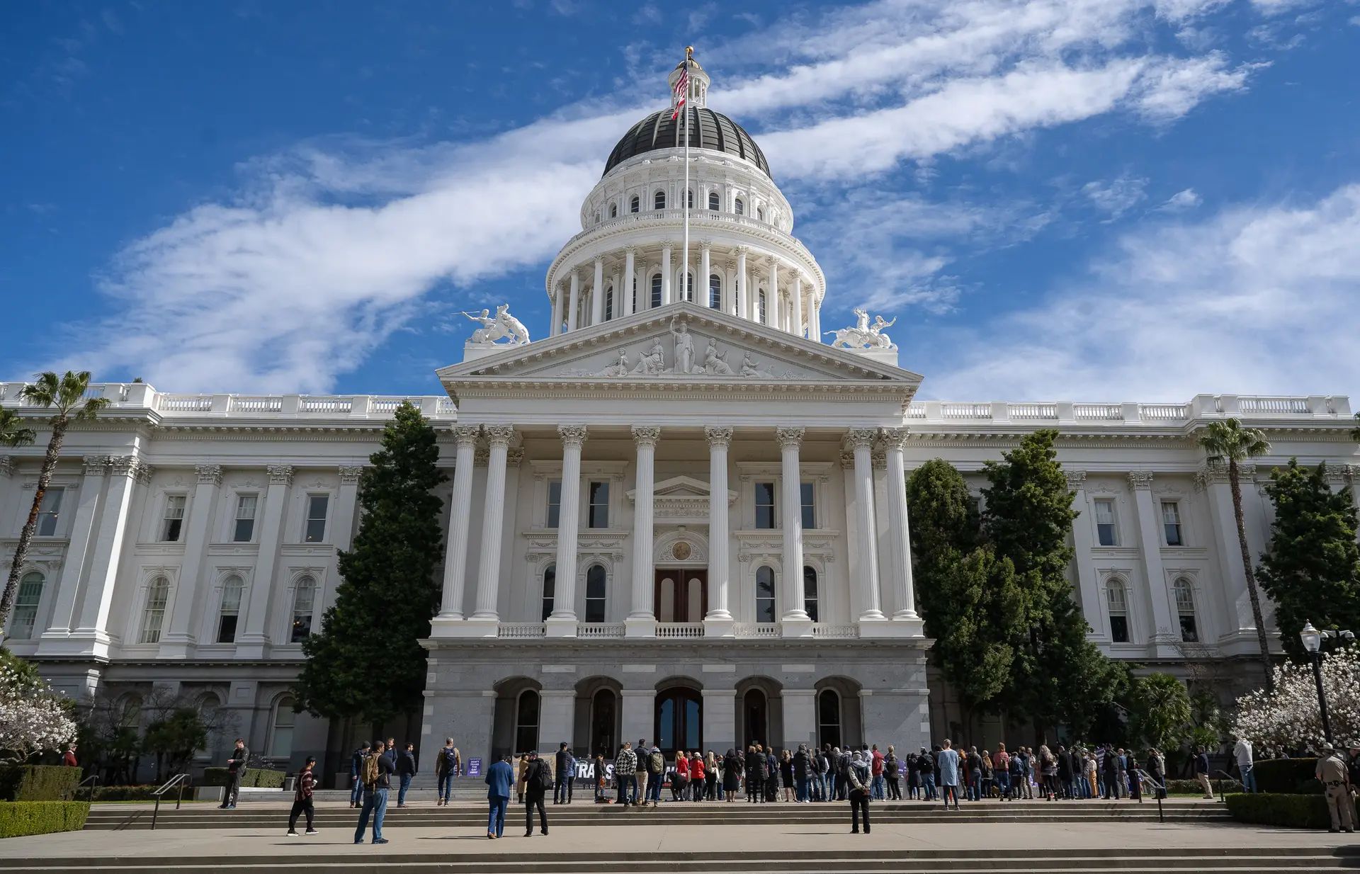 Pessoas se reúnem para compartilhar sobre a detransição em frente ao edifício do Capitólio do Estado da Califórnia, em Sacramento, Califórnia, em 10 de março de 2023. (John Fredricks/The Epoch Times)
