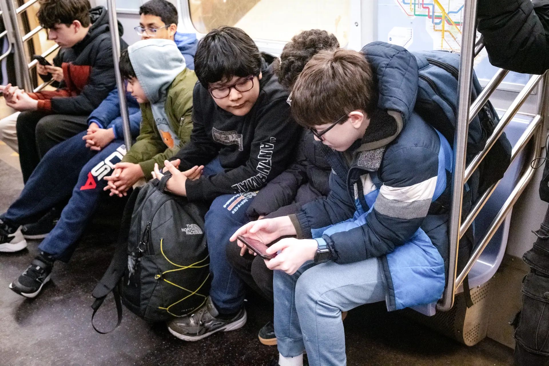 Meninos olham para um celular no metrô de Nova Iorque em 26 de março de 2026. Testemunhas especializadas no julgamento de K.G.M. afirmaram que o vício em redes sociais cresceu entre os jovens e é praticamente indistinguível do abuso de substâncias no cérebro, um ponto que deve continuar sendo o foco em um segundo caso. (Samira Bouaou/The Epoch Times)